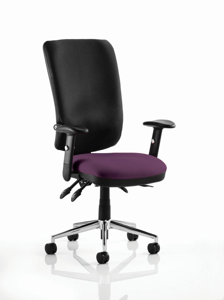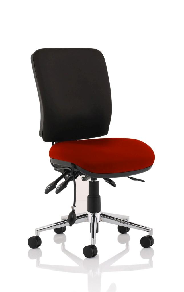 • Posture chair – approved by a UK Chiropractic Doctor • Height adjustable ratchet backrest with pump up lumbar support • Contoured foam seat and back for extra comfort • Triple lever independent mechanism • Independent seat and backrest tilt angle adjustment • Seat slide • Polished chrome 5 star base • Tested to BS 5459-2 • Gas lift tested up to: 150 kg • Usage: Task 24/7