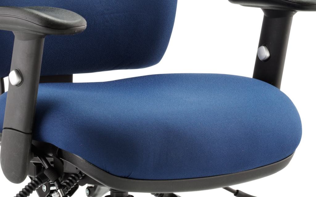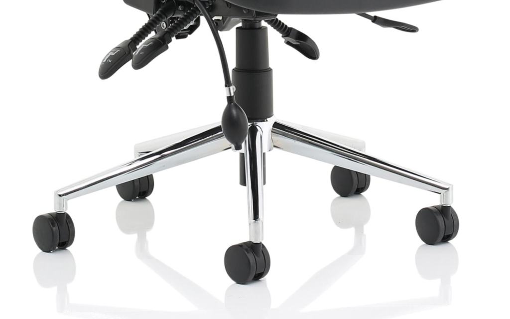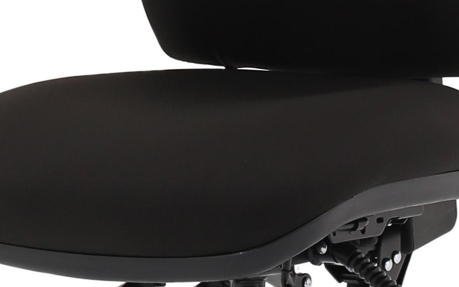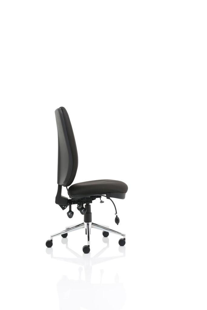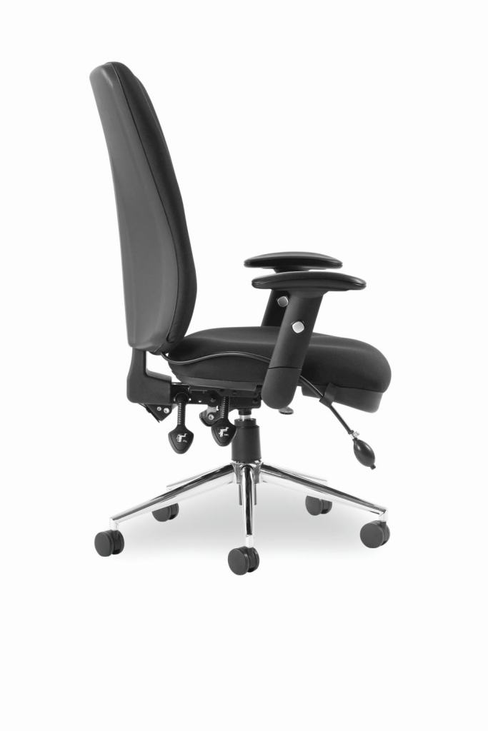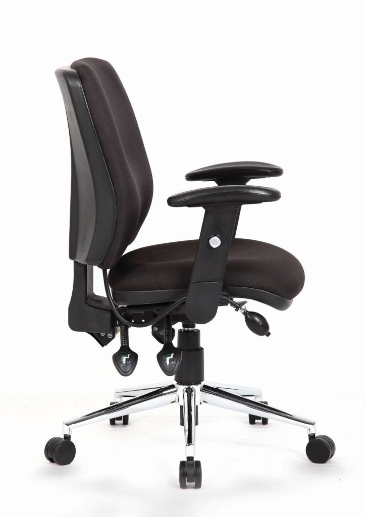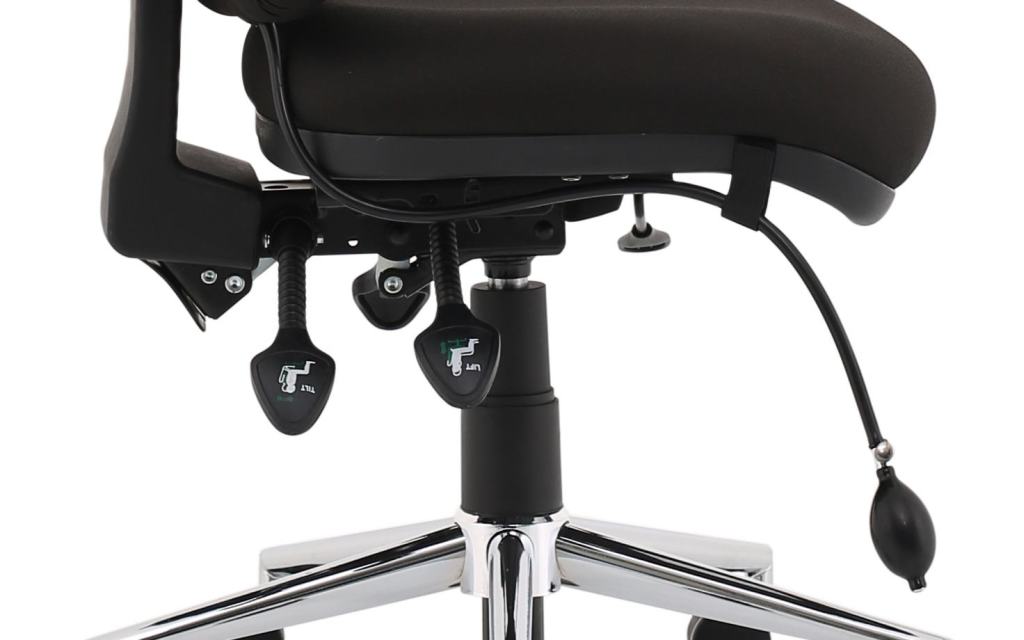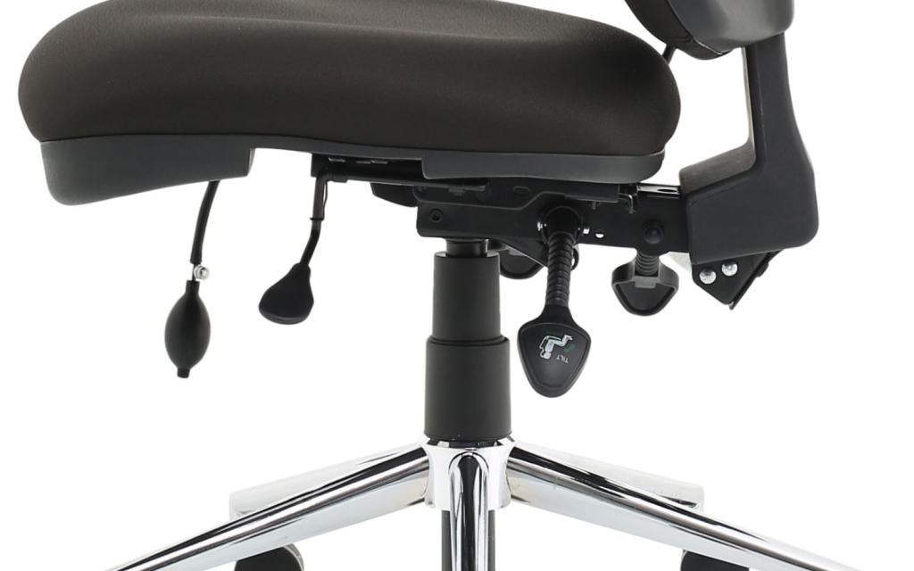 • Posture chair – approved by a UK Chiropractic Doctor • Height adjustable ratchet backrest with pump up lumbar support • Contoured foam seat and back for extra comfort • Triple lever independent mechanism • Independent seat and backrest tilt angle adjustment • Seat slide • Polished chrome 5 star base • Tested to BS 5459-2 • Gas lift tested up to: 150 kg • Usage: Task 24/7